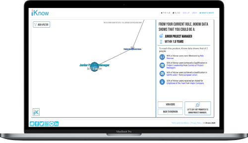 Our Artificial Intelligence-powered "What's Next?" tool allows you to see where other iKnow users have progressed in their careers from where you currently are. Is there a secret course, qualification or degree you might need to fast-track to success? The data you supply helps both you and others to work out the answers.